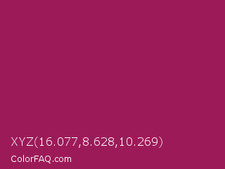 XYZ 16.077,8.628,10.269 Color is a normal rose color and the nearest color is Jazzberry Jam #a50b5e. Hex code #9d1a59 and RGB value is rgb(157,26,89). In RGB color space, this color is composed of 62% red, 10% green, 35% blue, In CMYK color space, this color is composed of 0% cyan, 83% magenta, 43% yellow , 38% black , In HSL color space, this color has a hue angle of 331° , 72% saturation and 36% lightness.