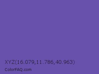 XYZ 16.079,11.786,40.963 Color is a normal indigo color and the nearest color is Blue Violet #6456b7. Hex code #6751ad and RGB value is rgb(103,81,173). In RGB color space, this color is composed of 40% red, 32% green, 68% blue, In CMYK color space, this color is composed of 40% cyan, 53% magenta, 0% yellow , 32% black , In HSL color space, this color has a hue angle of 254° , 36% saturation and 50% lightness.