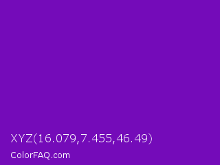 XYZ 16.079,7.455,46.49 Color is a normal purple color and the nearest color is Violet RYB #8601af. Hex code #740bb9 and RGB value is rgb(116,11,185). In RGB color space, this color is composed of 45% red, 4% green, 73% blue, In CMYK color space, this color is composed of 37% cyan, 94% magenta, 0% yellow , 27% black , In HSL color space, this color has a hue angle of 276° , 89% saturation and 38% lightness.