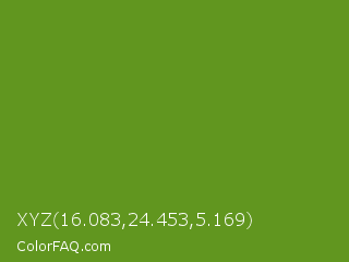 XYZ 16.083,24.453,5.169 Color is a normal green color and the nearest color is Olive Drab #6b8e23. Hex code #61961f and RGB value is rgb(97,150,31). In RGB color space, this color is composed of 38% red, 59% green, 12% blue, In CMYK color space, this color is composed of 35% cyan, 0% magenta, 79% yellow , 41% black , In HSL color space, this color has a hue angle of 87° , 66% saturation and 35% lightness.