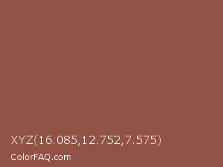 XYZ 16.085,12.752,7.575 Color is a normal red color and the nearest color is Spicy Mix #885342. Hex code #925347 and RGB value is rgb(146,83,71). In RGB color space, this color is composed of 57% red, 33% green, 28% blue, In CMYK color space, this color is composed of 0% cyan, 43% magenta, 51% yellow , 43% black , In HSL color space, this color has a hue angle of 10° , 35% saturation and 43% lightness.