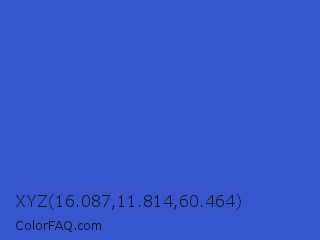XYZ 16.087,11.814,60.464 Color is a normal blue color and the nearest color is Cerulean Blue #2a52be. Hex code #3755cf and RGB value is rgb(55,85,207). In RGB color space, this color is composed of 22% red, 33% green, 81% blue, In CMYK color space, this color is composed of 73% cyan, 59% magenta, 0% yellow , 19% black , In HSL color space, this color has a hue angle of 228° , 61% saturation and 51% lightness.