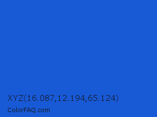 XYZ 16.087,12.194,65.124 Color is a normal blue color and the nearest color is New Car #214fc6. Hex code #1859d6 and RGB value is rgb(24,89,214). In RGB color space, this color is composed of 9% red, 35% green, 84% blue, In CMYK color space, this color is composed of 89% cyan, 58% magenta, 0% yellow , 16% black , In HSL color space, this color has a hue angle of 219° , 80% saturation and 47% lightness.