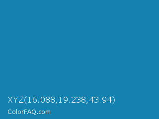 XYZ 16.088,19.238,43.94 Color is a normal blue color and the nearest color is Cyan Cornflower Blue #188bc2. Hex code #1382b0 and RGB value is rgb(19,130,176). In RGB color space, this color is composed of 7% red, 51% green, 69% blue, In CMYK color space, this color is composed of 89% cyan, 26% magenta, 0% yellow , 31% black , In HSL color space, this color has a hue angle of 198° , 81% saturation and 38% lightness.