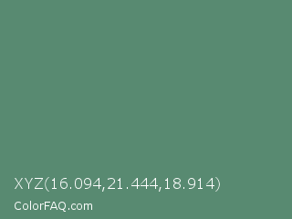 XYZ 16.094,21.444,18.914 Color is a normal green color and the nearest color is Wintergreen Dream #56887d. Hex code #588a71 and RGB value is rgb(88,138,113). In RGB color space, this color is composed of 35% red, 54% green, 44% blue, In CMYK color space, this color is composed of 36% cyan, 0% magenta, 18% yellow , 46% black , In HSL color space, this color has a hue angle of 150° , 22% saturation and 44% lightness.