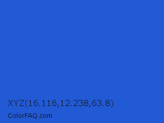 XYZ 16.116,12.238,63.8 Color is a normal blue color and the nearest color is New Car #214fc6. Hex code #2259d4 and RGB value is rgb(34,89,212). In RGB color space, this color is composed of 13% red, 35% green, 83% blue, In CMYK color space, this color is composed of 84% cyan, 58% magenta, 0% yellow , 17% black , In HSL color space, this color has a hue angle of 221° , 72% saturation and 48% lightness.