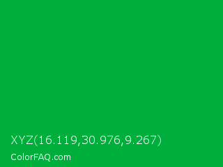 XYZ 16.119,30.976,9.267 Color is a normal green color and the nearest color is Green Pantone #00ad43. Hex code #00af3b and RGB value is rgb(0,175,59). In RGB color space, this color is composed of 0% red, 69% green, 23% blue, In CMYK color space, this color is composed of 100% cyan, 0% magenta, 66% yellow , 31% black , In HSL color space, this color has a hue angle of 140° , 100% saturation and 34% lightness.