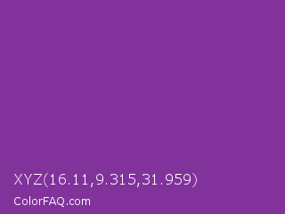 XYZ 16.11,9.315,31.959 Color is a normal purple color and the nearest color is Vivid Violet #803790. Hex code #81329b and RGB value is rgb(129,50,155). In RGB color space, this color is composed of 51% red, 20% green, 61% blue, In CMYK color space, this color is composed of 17% cyan, 68% magenta, 0% yellow , 39% black , In HSL color space, this color has a hue angle of 285° , 51% saturation and 40% lightness.