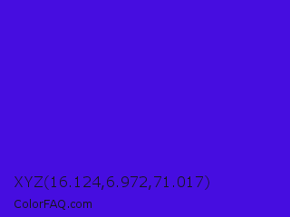 XYZ 16.124,6.972,71.017 Color is a normal indigo color and the nearest color is Interdimensional Blue #360ccc. Hex code #460de0 and RGB value is rgb(70,13,224). In RGB color space, this color is composed of 27% red, 5% green, 88% blue, In CMYK color space, this color is composed of 69% cyan, 94% magenta, 0% yellow , 12% black , In HSL color space, this color has a hue angle of 256° , 89% saturation and 46% lightness.