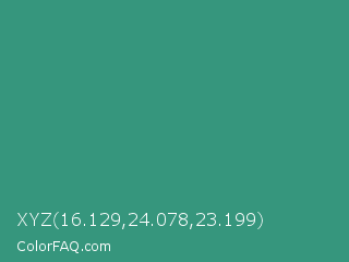 XYZ 16.129,24.078,23.199 Color is a normal cyan color and the nearest color is Illuminating Emerald #319177. Hex code #36967d and RGB value is rgb(54,150,125). In RGB color space, this color is composed of 21% red, 59% green, 49% blue, In CMYK color space, this color is composed of 64% cyan, 0% magenta, 17% yellow , 41% black , In HSL color space, this color has a hue angle of 164° , 47% saturation and 40% lightness.