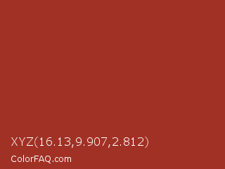 XYZ 16.13,9.907,2.812 Color is a normal red color and the nearest color is Roof Terracotta #a62f20. Hex code #a13125 and RGB value is rgb(161,49,37). In RGB color space, this color is composed of 63% red, 19% green, 15% blue, In CMYK color space, this color is composed of 0% cyan, 70% magenta, 77% yellow , 37% black , In HSL color space, this color has a hue angle of 6° , 63% saturation and 39% lightness.