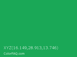 XYZ 16.149,28.913,13.746 Color is a normal green color and the nearest color is Green Pigment #00a550. Hex code #1aa857 and RGB value is rgb(26,168,87). In RGB color space, this color is composed of 10% red, 66% green, 34% blue, In CMYK color space, this color is composed of 85% cyan, 0% magenta, 48% yellow , 34% black , In HSL color space, this color has a hue angle of 146° , 73% saturation and 38% lightness.
