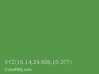 XYZ 16.14,24.606,10.377 Color is a normal green color and the nearest color is May Green #4c9141. Hex code #56974a and RGB value is rgb(86,151,74). In RGB color space, this color is composed of 34% red, 59% green, 29% blue, In CMYK color space, this color is composed of 43% cyan, 0% magenta, 51% yellow , 41% black , In HSL color space, this color has a hue angle of 111° , 34% saturation and 44% lightness.