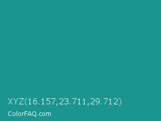 XYZ 16.157,23.711,29.712 Color is a normal cyan color and the nearest color is Blue Chill #0c8990. Hex code #1b958f and RGB value is rgb(27,149,143). In RGB color space, this color is composed of 11% red, 58% green, 56% blue, In CMYK color space, this color is composed of 82% cyan, 0% magenta, 4% yellow , 42% black , In HSL color space, this color has a hue angle of 177° , 69% saturation and 35% lightness.