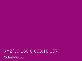 XYZ 16.168,8.063,18.157 Color is a normal magenta color and the nearest color is Flirt #a2006d. Hex code #970777 and RGB value is rgb(151,7,119). In RGB color space, this color is composed of 59% red, 3% green, 47% blue, In CMYK color space, this color is composed of 0% cyan, 95% magenta, 21% yellow , 41% black , In HSL color space, this color has a hue angle of 313° , 91% saturation and 31% lightness.