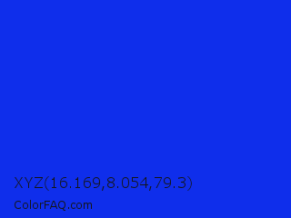 XYZ 16.169,8.054,79.3 Color is a normal blue color and the nearest color is Bluebonnet #1c1cf0. Hex code #0f2eeb and RGB value is rgb(15,46,235). In RGB color space, this color is composed of 6% red, 18% green, 92% blue, In CMYK color space, this color is composed of 94% cyan, 80% magenta, 0% yellow , 8% black , In HSL color space, this color has a hue angle of 232° , 88% saturation and 49% lightness.