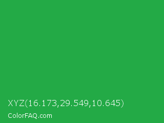 XYZ 16.173,29.549,10.645 Color is a normal green color and the nearest color is Wageningen Green #34b233. Hex code #23aa46 and RGB value is rgb(35,170,70). In RGB color space, this color is composed of 14% red, 67% green, 27% blue, In CMYK color space, this color is composed of 79% cyan, 0% magenta, 59% yellow , 33% black , In HSL color space, this color has a hue angle of 136° , 66% saturation and 40% lightness.