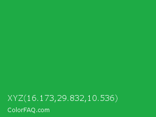 XYZ 16.173,29.832,10.536 Color is a normal green color and the nearest color is Wageningen Green #34b233. Hex code #1eab45 and RGB value is rgb(30,171,69). In RGB color space, this color is composed of 12% red, 67% green, 27% blue, In CMYK color space, this color is composed of 82% cyan, 0% magenta, 60% yellow , 33% black , In HSL color space, this color has a hue angle of 137° , 70% saturation and 39% lightness.