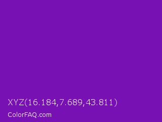 XYZ 16.184,7.689,43.811 Color is a normal purple color and the nearest color is Violet RYB #8601af. Hex code #7811b4 and RGB value is rgb(120,17,180). In RGB color space, this color is composed of 47% red, 7% green, 71% blue, In CMYK color space, this color is composed of 33% cyan, 91% magenta, 0% yellow , 29% black , In HSL color space, this color has a hue angle of 278° , 83% saturation and 39% lightness.
