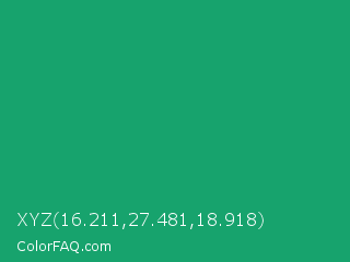 XYZ 16.211,27.481,18.918 Color is a normal green color and the nearest color is Green Crayola #1cac78. Hex code #17a36d and RGB value is rgb(23,163,109). In RGB color space, this color is composed of 9% red, 64% green, 43% blue, In CMYK color space, this color is composed of 86% cyan, 0% magenta, 33% yellow , 36% black , In HSL color space, this color has a hue angle of 157° , 75% saturation and 36% lightness.