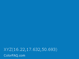 XYZ 16.22,17.632,50.693 Color is a normal blue color and the nearest color is Ocean Boat Blue #0077be. Hex code #067abd and RGB value is rgb(6,122,189). In RGB color space, this color is composed of 2% red, 48% green, 74% blue, In CMYK color space, this color is composed of 97% cyan, 35% magenta, 0% yellow , 26% black , In HSL color space, this color has a hue angle of 202° , 94% saturation and 38% lightness.