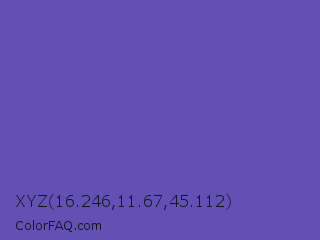 XYZ 16.246,11.67,45.112 Color is a normal indigo color and the nearest color is Blue Violet #6456b7. Hex code #6250b5 and RGB value is rgb(98,80,181). In RGB color space, this color is composed of 38% red, 31% green, 71% blue, In CMYK color space, this color is composed of 46% cyan, 56% magenta, 0% yellow , 29% black , In HSL color space, this color has a hue angle of 251° , 41% saturation and 51% lightness.