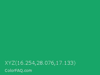 XYZ 16.254,28.076,17.133 Color is a normal green color and the nearest color is Green Crayola #1cac78. Hex code #19a566 and RGB value is rgb(25,165,102). In RGB color space, this color is composed of 10% red, 65% green, 40% blue, In CMYK color space, this color is composed of 85% cyan, 0% magenta, 38% yellow , 35% black , In HSL color space, this color has a hue angle of 153° , 74% saturation and 37% lightness.