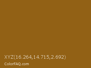 XYZ 16.264,14.715,2.692 Color is a normal orange color and the nearest color is Golden Brown #996515. Hex code #926115 and RGB value is rgb(146,97,21). In RGB color space, this color is composed of 57% red, 38% green, 8% blue, In CMYK color space, this color is composed of 0% cyan, 34% magenta, 86% yellow , 43% black , In HSL color space, this color has a hue angle of 36° , 75% saturation and 33% lightness.