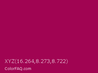 XYZ 16.264,8.273,8.722 Color is a normal rose color and the nearest color is Jazzberry Jam #a50b5e. Hex code #a10452 and RGB value is rgb(161,4,82). In RGB color space, this color is composed of 63% red, 2% green, 32% blue, In CMYK color space, this color is composed of 0% cyan, 98% magenta, 49% yellow , 37% black , In HSL color space, this color has a hue angle of 330° , 95% saturation and 32% lightness.