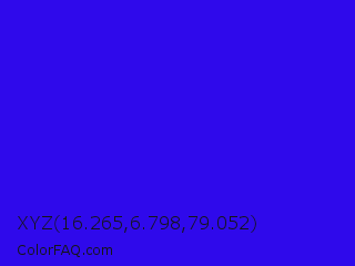 XYZ 16.265,6.798,79.052 Color is a normal indigo color and the nearest color is Electric Ultramarine #3f00ff. Hex code #2f09eb and RGB value is rgb(47,9,235). In RGB color space, this color is composed of 18% red, 4% green, 92% blue, In CMYK color space, this color is composed of 80% cyan, 96% magenta, 0% yellow , 8% black , In HSL color space, this color has a hue angle of 250° , 93% saturation and 48% lightness.
