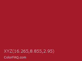 XYZ 16.265,8.855,2.95 Color is a normal red color and the nearest color is Upsdell Red #ae2029. Hex code #a51929 and RGB value is rgb(165,25,41). In RGB color space, this color is composed of 65% red, 10% green, 16% blue, In CMYK color space, this color is composed of 0% cyan, 85% magenta, 75% yellow , 35% black , In HSL color space, this color has a hue angle of 353° , 74% saturation and 37% lightness.