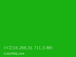 XYZ 16.266,31.711,5.88 Color is a normal green color and the nearest color is Slimy Green #299617. Hex code #1ab113 and RGB value is rgb(26,177,19). In RGB color space, this color is composed of 10% red, 69% green, 7% blue, In CMYK color space, this color is composed of 85% cyan, 0% magenta, 89% yellow , 31% black , In HSL color space, this color has a hue angle of 117° , 81% saturation and 38% lightness.