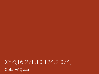 XYZ 16.271,10.124,2.074 Color is a normal red color and the nearest color is Cognac #9f381d. Hex code #a2331a and RGB value is rgb(162,51,26). In RGB color space, this color is composed of 64% red, 20% green, 10% blue, In CMYK color space, this color is composed of 0% cyan, 69% magenta, 84% yellow , 36% black , In HSL color space, this color has a hue angle of 11° , 72% saturation and 37% lightness.