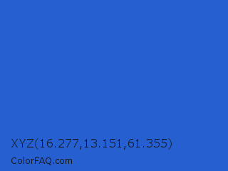 XYZ 16.277,13.151,61.355 Color is a normal blue color and the nearest color is Mariner #286acd. Hex code #265fd0 and RGB value is rgb(38,95,208). In RGB color space, this color is composed of 15% red, 37% green, 82% blue, In CMYK color space, this color is composed of 82% cyan, 54% magenta, 0% yellow , 18% black , In HSL color space, this color has a hue angle of 220° , 69% saturation and 48% lightness.