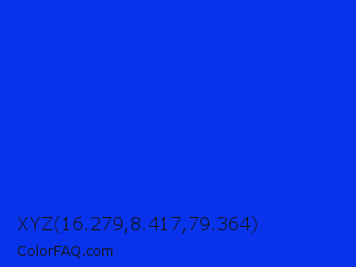 XYZ 16.279,8.417,79.364 Color is a normal blue color and the nearest color is Blue RYB #0247fe. Hex code #0833eb and RGB value is rgb(8,51,235). In RGB color space, this color is composed of 3% red, 20% green, 92% blue, In CMYK color space, this color is composed of 97% cyan, 78% magenta, 0% yellow , 8% black , In HSL color space, this color has a hue angle of 229° , 93% saturation and 48% lightness.