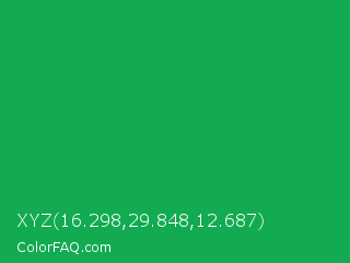 XYZ 16.298,29.848,12.687 Color is a normal green color and the nearest color is Green Pigment #00a550. Hex code #12ab51 and RGB value is rgb(18,171,81). In RGB color space, this color is composed of 7% red, 67% green, 32% blue, In CMYK color space, this color is composed of 89% cyan, 0% magenta, 53% yellow , 33% black , In HSL color space, this color has a hue angle of 145° , 81% saturation and 37% lightness.
