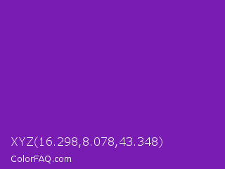 XYZ 16.298,8.078,43.348 Color is a normal purple color and the nearest color is Grape #6f2da8. Hex code #781cb3 and RGB value is rgb(120,28,179). In RGB color space, this color is composed of 47% red, 11% green, 70% blue, In CMYK color space, this color is composed of 33% cyan, 84% magenta, 0% yellow , 30% black , In HSL color space, this color has a hue angle of 277° , 73% saturation and 41% lightness.
