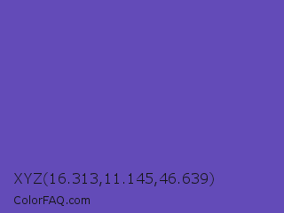 XYZ 16.313,11.145,46.639 Color is a normal indigo color and the nearest color is Blue Violet #6456b7. Hex code #634bb8 and RGB value is rgb(99,75,184). In RGB color space, this color is composed of 39% red, 29% green, 72% blue, In CMYK color space, this color is composed of 46% cyan, 59% magenta, 0% yellow , 28% black , In HSL color space, this color has a hue angle of 253° , 43% saturation and 51% lightness.