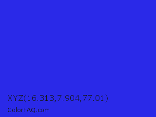XYZ 16.313,7.904,77.01 Color is a normal blue color and the nearest color is Palatinate Blue #273be2. Hex code #2a29e8 and RGB value is rgb(42,41,232). In RGB color space, this color is composed of 16% red, 16% green, 91% blue, In CMYK color space, this color is composed of 82% cyan, 82% magenta, 0% yellow , 9% black , In HSL color space, this color has a hue angle of 240° , 81% saturation and 54% lightness.
