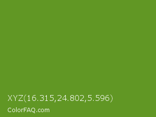 XYZ 16.315,24.802,5.596 Color is a normal green color and the nearest color is Olive Drab #6b8e23. Hex code #619724 and RGB value is rgb(97,151,36). In RGB color space, this color is composed of 38% red, 59% green, 14% blue, In CMYK color space, this color is composed of 36% cyan, 0% magenta, 76% yellow , 41% black , In HSL color space, this color has a hue angle of 88° , 61% saturation and 37% lightness.