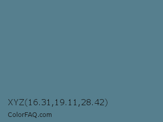XYZ 16.31,19.11,28.42 Color is a normal blue color and the nearest color is Smalt Blue #51808f. Hex code #567f8e and RGB value is rgb(86,127,142). In RGB color space, this color is composed of 34% red, 50% green, 56% blue, In CMYK color space, this color is composed of 39% cyan, 11% magenta, 0% yellow , 44% black , In HSL color space, this color has a hue angle of 196° , 25% saturation and 45% lightness.