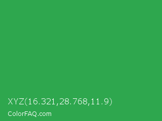 XYZ 16.321,28.768,11.9 Color is a normal green color and the nearest color is Chateau Green #40a860. Hex code #2ea74e and RGB value is rgb(46,167,78). In RGB color space, this color is composed of 18% red, 65% green, 31% blue, In CMYK color space, this color is composed of 72% cyan, 0% magenta, 53% yellow , 35% black , In HSL color space, this color has a hue angle of 136° , 57% saturation and 42% lightness.