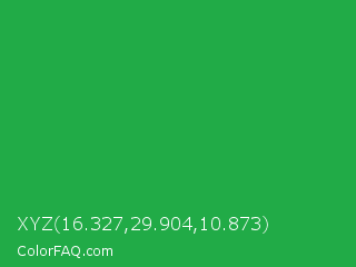 XYZ 16.327,29.904,10.873 Color is a normal green color and the nearest color is Wageningen Green #34b233. Hex code #21ab47 and RGB value is rgb(33,171,71). In RGB color space, this color is composed of 13% red, 67% green, 28% blue, In CMYK color space, this color is composed of 81% cyan, 0% magenta, 58% yellow , 33% black , In HSL color space, this color has a hue angle of 137° , 68% saturation and 40% lightness.