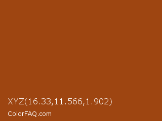 XYZ 16.33,11.566,1.902 Color is a normal orange color and the nearest color is Oregon #9b4703. Hex code #9e4511 and RGB value is rgb(158,69,17). In RGB color space, this color is composed of 62% red, 27% green, 7% blue, In CMYK color space, this color is composed of 0% cyan, 56% magenta, 89% yellow , 38% black , In HSL color space, this color has a hue angle of 22° , 81% saturation and 34% lightness.