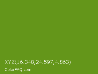 XYZ 16.348,24.597,4.863 Color is a normal green color and the nearest color is Olive Drab #6b8e23. Hex code #64961a and RGB value is rgb(100,150,26). In RGB color space, this color is composed of 39% red, 59% green, 10% blue, In CMYK color space, this color is composed of 33% cyan, 0% magenta, 83% yellow , 41% black , In HSL color space, this color has a hue angle of 84° , 70% saturation and 35% lightness.