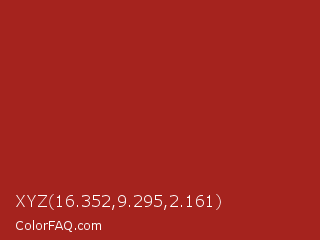 XYZ 16.352,9.295,2.161 Color is a normal red color and the nearest color is Mexican Red #a72525. Hex code #a5231e and RGB value is rgb(165,35,30). In RGB color space, this color is composed of 65% red, 14% green, 12% blue, In CMYK color space, this color is composed of 0% cyan, 79% magenta, 82% yellow , 35% black , In HSL color space, this color has a hue angle of 2° , 69% saturation and 38% lightness.