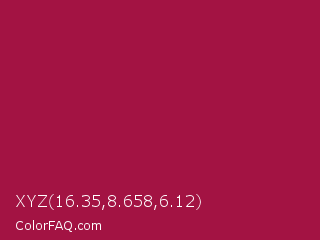 XYZ 16.35,8.658,6.12 Color is a normal rose color and the nearest color is French Wine #ac1e44. Hex code #a31343 and RGB value is rgb(163,19,67). In RGB color space, this color is composed of 64% red, 7% green, 26% blue, In CMYK color space, this color is composed of 0% cyan, 88% magenta, 59% yellow , 36% black , In HSL color space, this color has a hue angle of 340° , 79% saturation and 36% lightness.