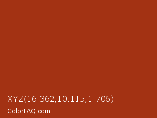 XYZ 16.362,10.115,1.706 Color is a normal red color and the nearest color is Tabasco #a02712. Hex code #a33213 and RGB value is rgb(163,50,19). In RGB color space, this color is composed of 64% red, 20% green, 7% blue, In CMYK color space, this color is composed of 0% cyan, 69% magenta, 88% yellow , 36% black , In HSL color space, this color has a hue angle of 13° , 79% saturation and 36% lightness.