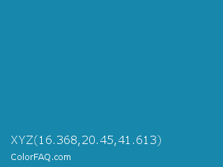 XYZ 16.368,20.45,41.613 Color is a normal blue color and the nearest color is Eastern Blue #1e9ab0. Hex code #1787ab and RGB value is rgb(23,135,171). In RGB color space, this color is composed of 9% red, 53% green, 67% blue, In CMYK color space, this color is composed of 87% cyan, 21% magenta, 0% yellow , 33% black , In HSL color space, this color has a hue angle of 195° , 76% saturation and 38% lightness.