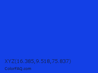 XYZ 16.385,9.518,75.837 Color is a normal blue color and the nearest color is Palatinate Blue #273be2. Hex code #1340e6 and RGB value is rgb(19,64,230). In RGB color space, this color is composed of 7% red, 25% green, 90% blue, In CMYK color space, this color is composed of 92% cyan, 72% magenta, 0% yellow , 10% black , In HSL color space, this color has a hue angle of 227° , 85% saturation and 49% lightness.